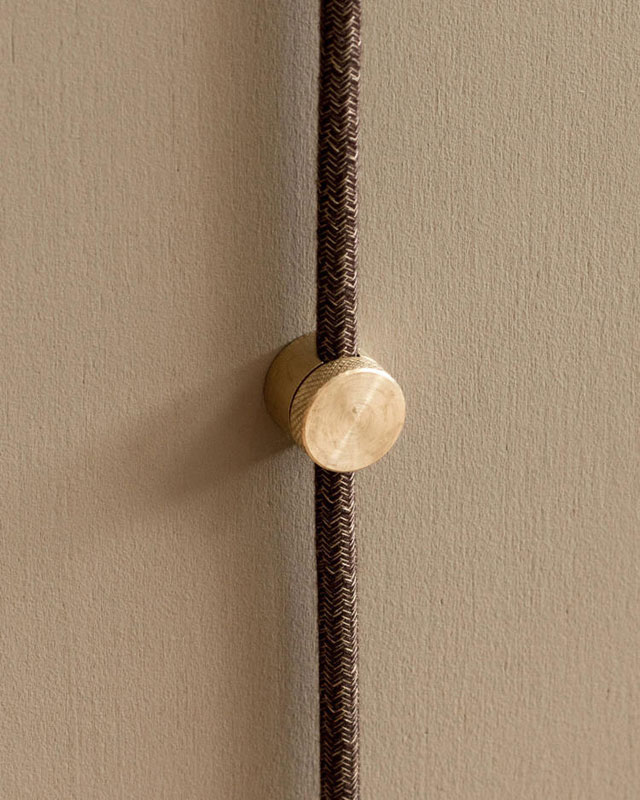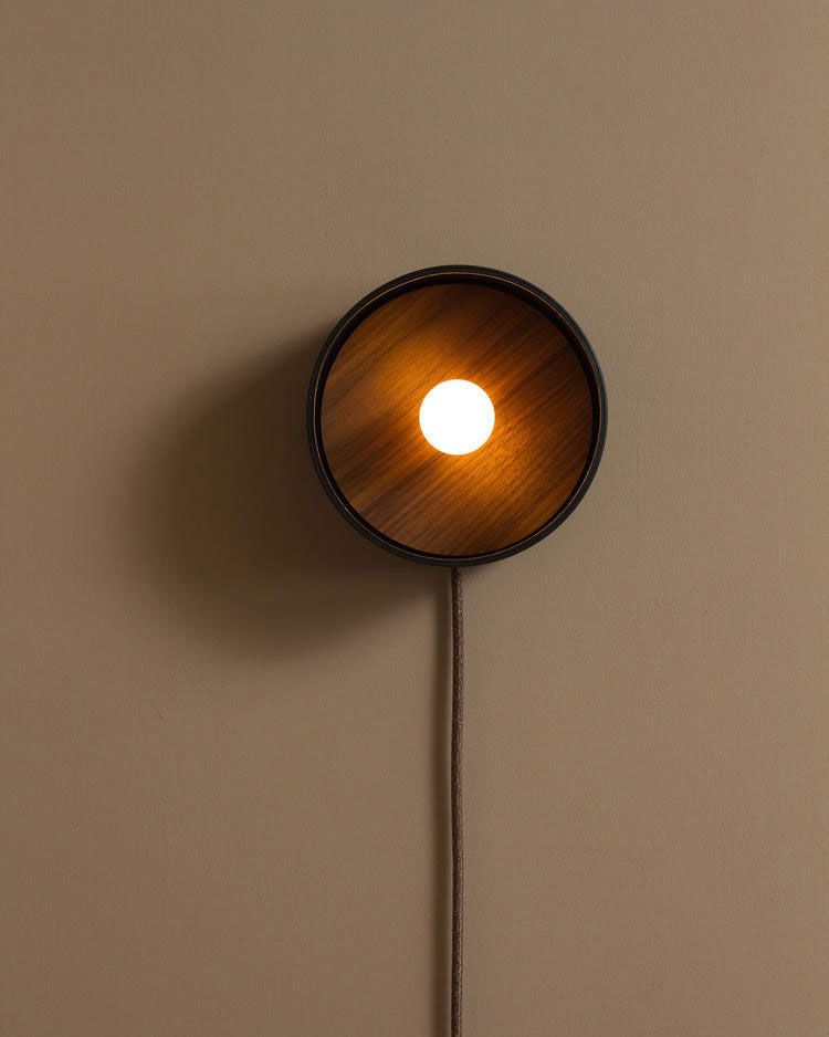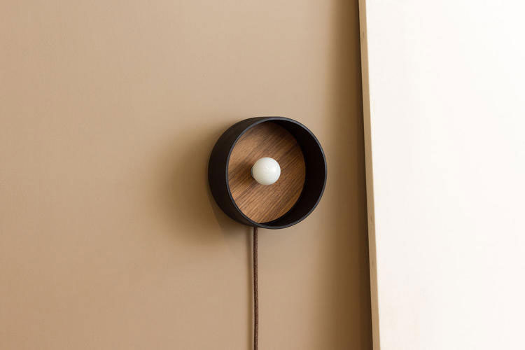 比如最新推出的 ODIS SCONCE 系列,手工制作,结合了极简主义风格和工业风,由圆形钢制框架和美国黑胡桃木组合构成,球形灯泡镶嵌于中心位置。整体灯具采用插入式设计,允许用户将其安装在相对靠近插座的任何位置,相对较为灵活。
