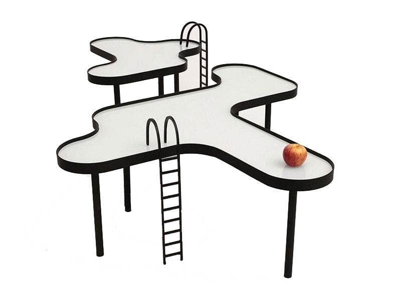 巴西圣保罗的 Estúdio Rain工作室, 喜欢将日常生活用品,加上艺术气色或重新演绎,为物件添上一点点的幽默感。「游泳池」系列桌子,由一个个不同游泳池形状的矮桌组成,桌子的框架和游泳池的下水梯采用了喷涂钢材料,而桌面由玻璃制成。使用者可以自由调整下水梯的位置,DIY 出自己最想要的效果,玩味感十足。