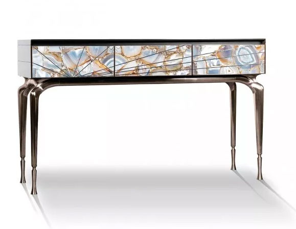 Visionnaire是意大利的家居设计品牌,以华丽优雅的维多利亚式和新巴洛克风格为主。这款aurora边桌是visionnaire携手梁志天合作设计的,精美绝伦的桌面由大理石、缟玛瑙及半宝石拼嵌组合,以独特的设计手法打造出精致细腻的质感。标准型桌子和吸烟桌皆以有机材料作底座,辅以优雅流畅的曲线造型、金属饰面,搭配缟玛瑙及半宝石台面。