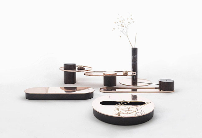 “相生”系列是明合文吉对设计思维的新探索。在空间与家具之间,有与无之间,虚与实,寻求一种思辨。让设计从“无”开始,着眼于“有”之外的空间,让“无”展现出更大的可能性。从整体中截取出的那块“无用”物体,当它独立存在时便成为一件完整的家具,相对论的思维方式给设计带来新的可能性,有无之间, 偶然成为必然。它可以是一件实用的家具,也可以是一件雕塑。黄铜与绿锈是一种物质的两种时期的状态,它们的同时出现,也表达了过去与现在,现在与未来时空的共存性。