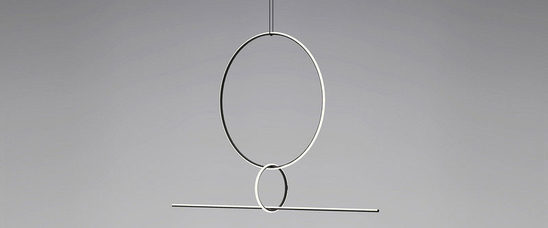 Michael Anastassiades为flos设计的“编排”系列造型优美地悬挂在Euroluce灯饰展的Flos展厅中,这一系列“是一组几何灯具元素的模块系统,使用者可以依照不同方式将多个模块进行组合,创造出多种不同配置,构成多款不同的吊灯。