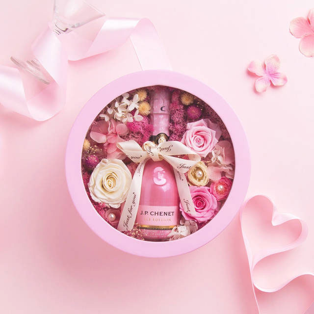 甜蜜和浪漫的绝美搭配,法国进口香奈J.P.Chenet半干型桃红起泡葡萄酒,藏在纯手工定制粉色蔷薇永生花盒里,绝对适合男票讨媳妇的欢心,况且红酒也是浪漫调情必备酒品,所以无论是创意亦或是造型,满分。