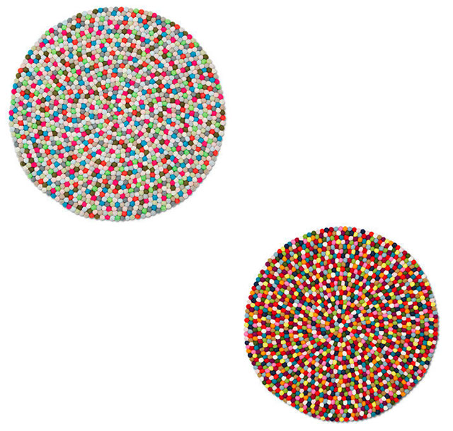 PINOCCHIO地毯是以一种丹麦糖果——彩色糖衣甘草的名字命名的。色彩鲜艳的毛毡球由手工匠人一个个单独搓成小球用线串起并缝制成圆形的地毯。手工制作的传统工艺方法在印度和尼泊尔当地民间是可持续的生产方式。