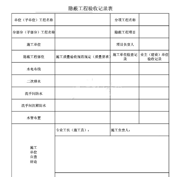隐蔽工程验收是一项较为需要技术含量的工作,从业人员一般是有很好的验收经验与经历,对隐蔽工程验收规范都有自己的理解,一般他们都需要准备隐蔽工程验收记录表去验收地点进行每个地方的查验,然后记录下来每个地方的验收状况。